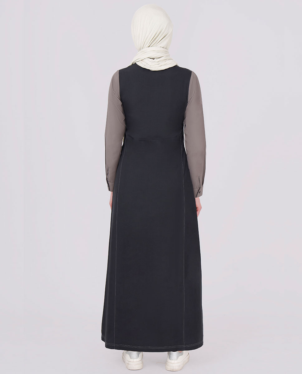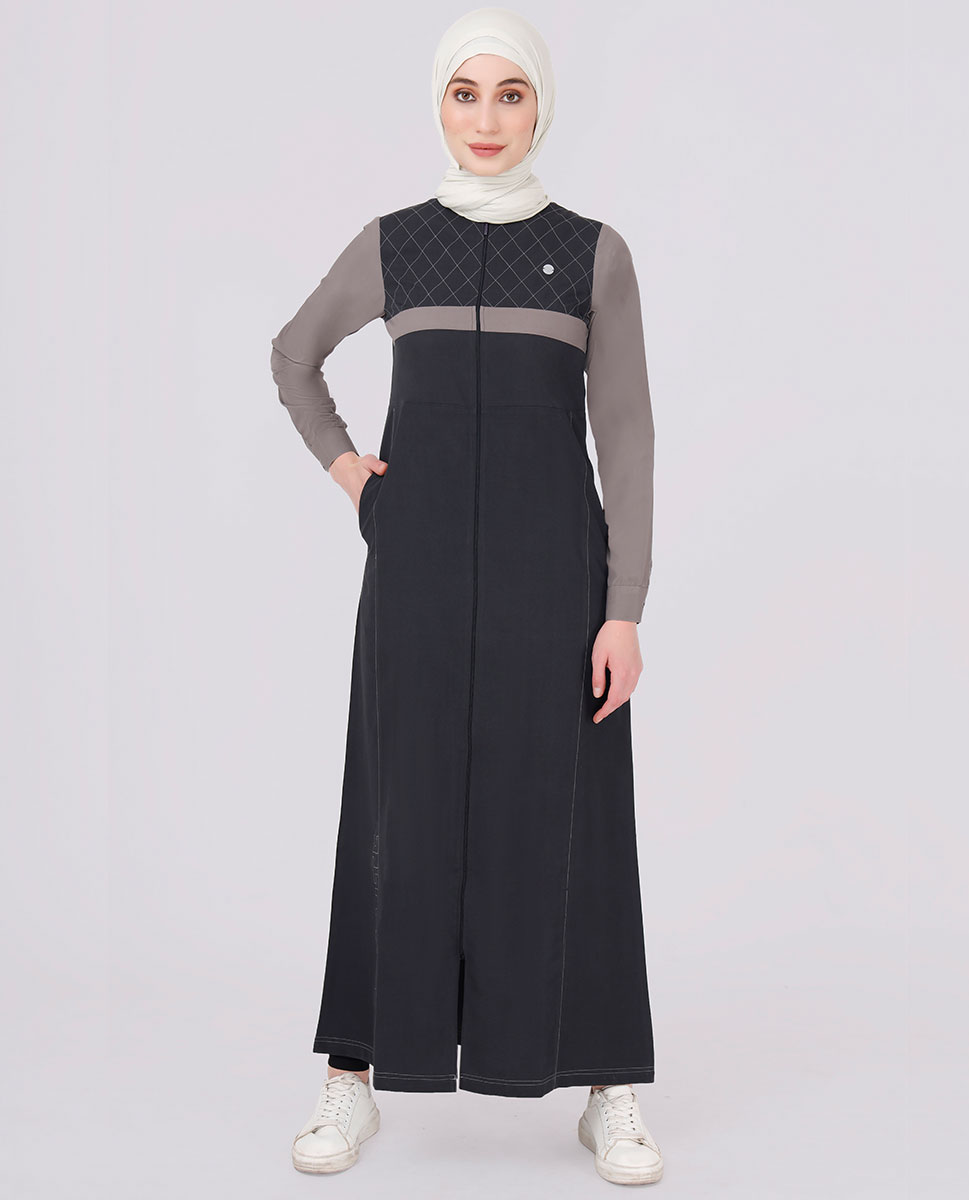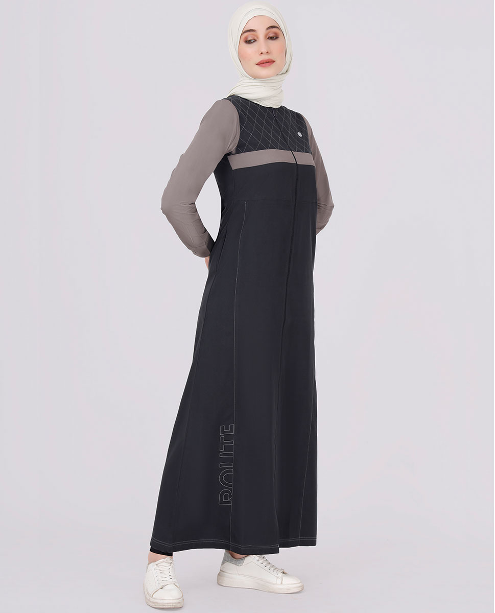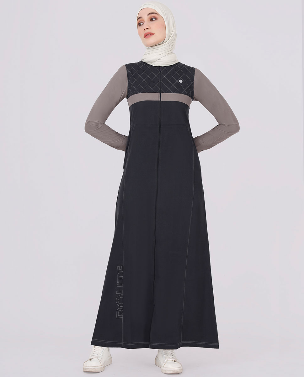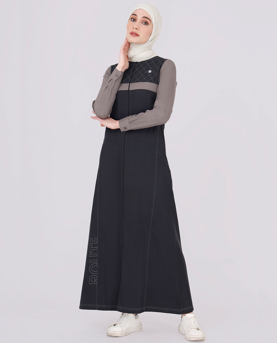 Our Model is UK size 8. She’s wearing a size small, regular fit Abaya. She’s also wearing an InEssence Hijab.