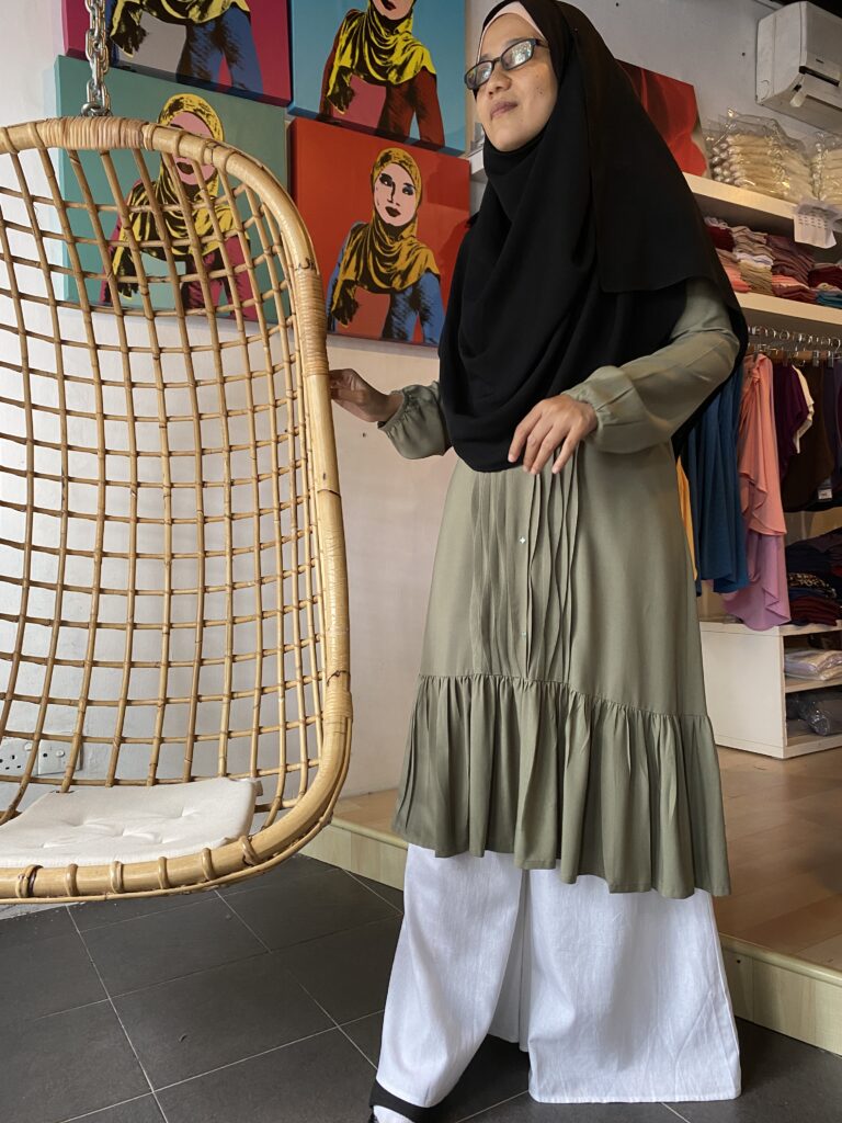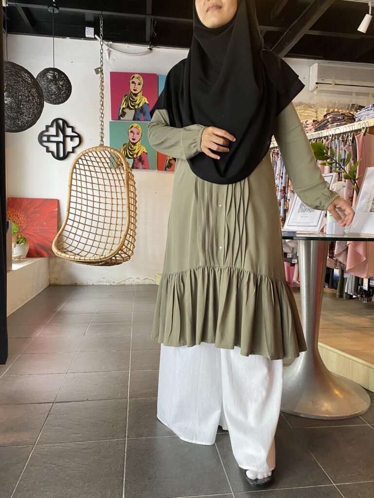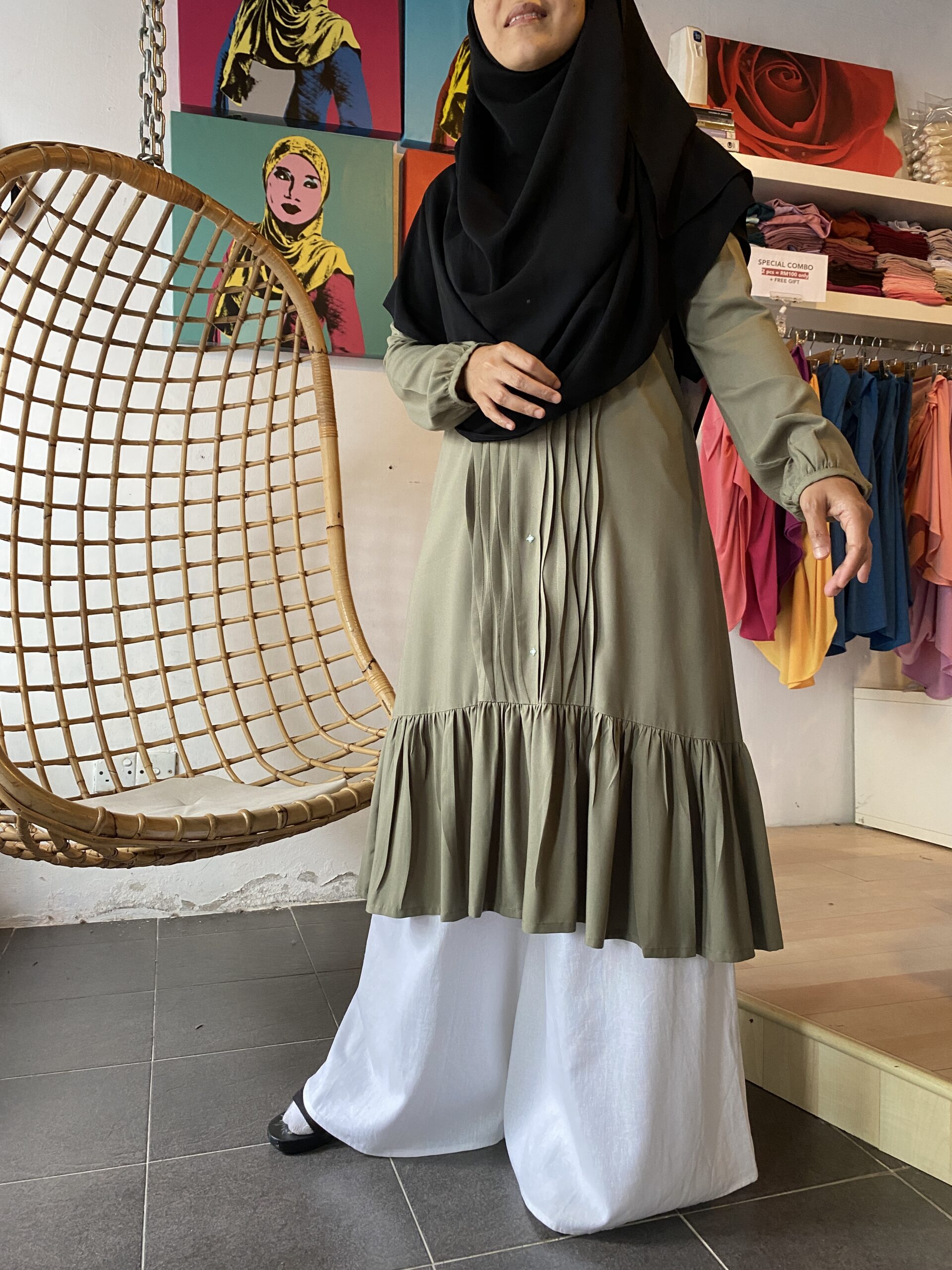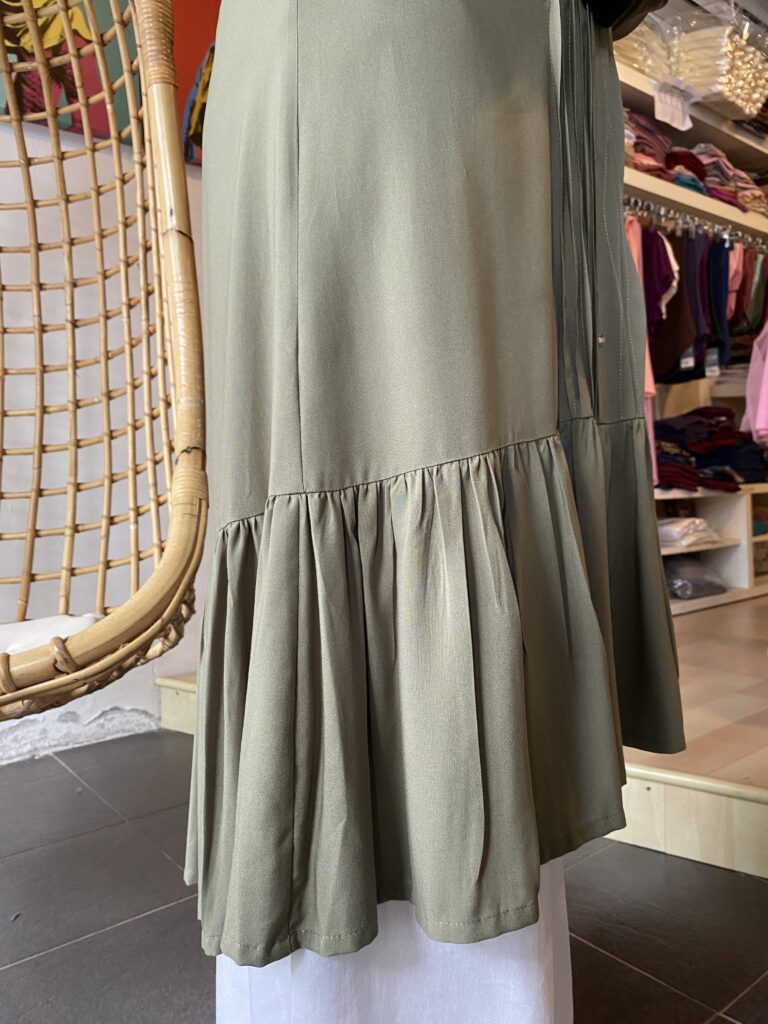 A midi long dress with a circle round collar, long sleeves, pleated at centre and a ruffle hemline. Super floaty and super chic!